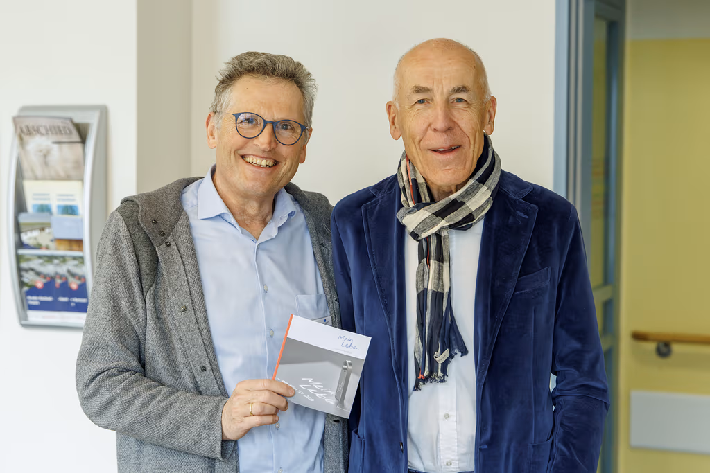 Kickoff-Veranstaltung "Mein Leben e.V." im Klinikum St. Marien in Amberg im Frühjahr 2025: Vorsitzender Dr. Bernward Gall überreicht den ersten Flyer des Vereins „Mein Leben e.V.“ an den Ärztlichen Direktor Dr. Harald Hollnberger. Das Kliniikum St. Marien in Amberg ist der erste Kooperationspartner des neu gegründeten Vereins. Foto: altrofoto.de