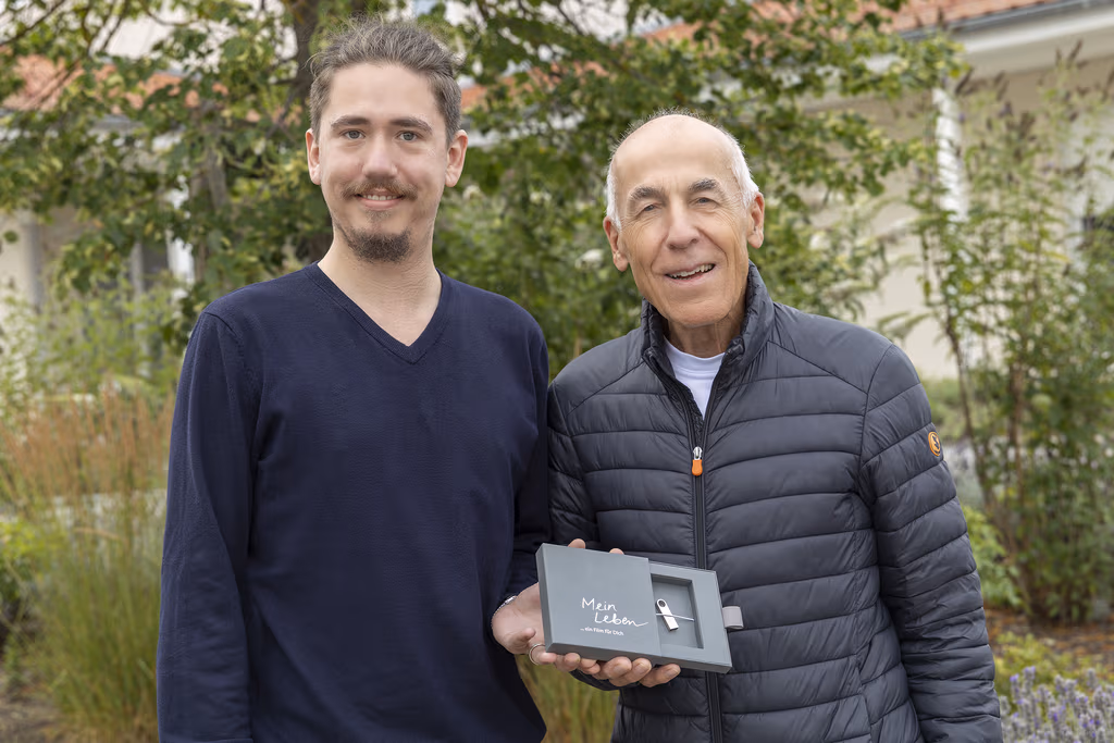 Erste offizielle Übergabe eines Film-Interviews mit einer Patientin an ihren Sohn durch den Vorsitzenden Dr. Bernward Gall: Die mittlerweile verstorbene Patientin hatte verfügt, dass ihr Sohn Nikolaj den Film als Erinnerung erhalten soll. Der Film wird auf einem USB-Stick in einer dezenten Hülle mit dem geprägten Vereinlogo übergeben. Foto: altrofoto.de